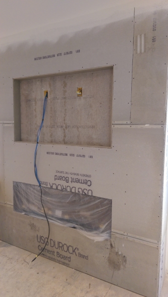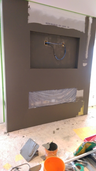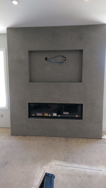 We were asked to produce a polished concrete look for this fireplace in a new custom home in Maple Ridge. The backing substrate is Durock cement board, and we applied a special concrete bonding agent to the cement board prior to applying any tape or plaster. As you can see in the photos, all the external angles were applied with tile adhesive, and the entire structure was first taped in with cement board joint tape, and then alkaline resistant fiberglass stucco mesh was embedded into the entire first coat to further reduce cracking.