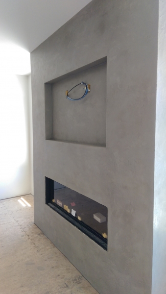 To create depth and a deeper tones this fireplace has olive oil soap added and a wax to create the final look. Two coats of Meoded’s Golmex concrete plaster were used to create this custom one of a kind look. This finish can be made more or less shiny, can be sanded once dry and or made to look like form board concrete, concrete walls with holes in it, or anything in between. As always with our plasters and systems, paint is just the beginning!
